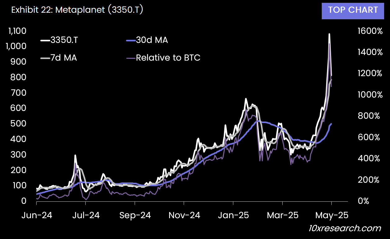 Metaplanet (3350.T is above the 7-day moving average -> bullish, and is above the 30-day moving average -> bullish, with 1 week change of +34.2%) triggered a short squeeze, with 25% of shares shorted, fueling a 108% rally. Metaplanet is listed under the ticker DN3 on the GETEX exchange in Germany. On May 20, 2025, 2.51 million shares of DN3 were traded, amounting to €15.35 million in transaction value. Record Q1 2025 revenue of 877 million yen ($6 million) from Bitcoin strategies boosted investor confidence. Trading halts on the Tokyo Stock Exchange due to daily limit-ups intensified FOMO, driving prices higher.